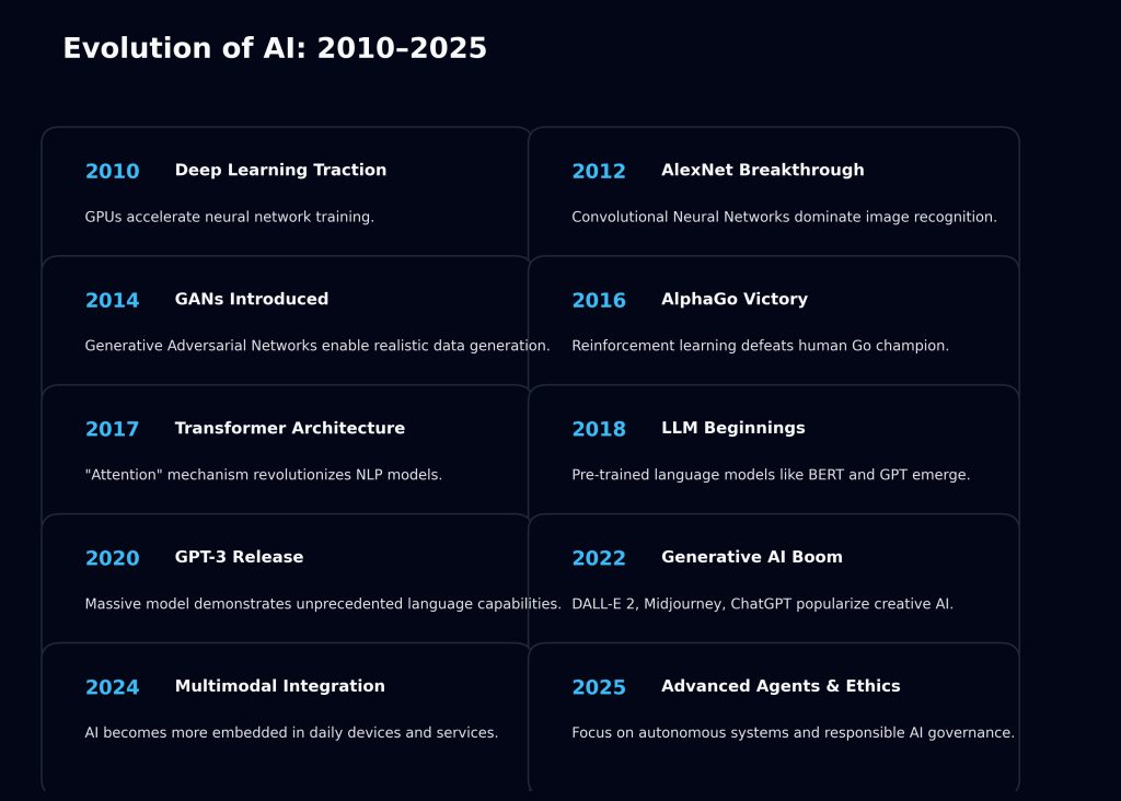 - The AI revolution has been building for over a decade, though mainstream adoption only took off in the last two to three years. The real game-changer came in 2017 with Transformer architecture, which let models understand and generate language at massive scale. This breakthrough paved the way for systems like GPT-3 and the powerful large language models now used across industries. The timeline tracks this journey from deep-learning momentum in 2010 all the way to multimodal and agent-driven capabilities expected in 2025.