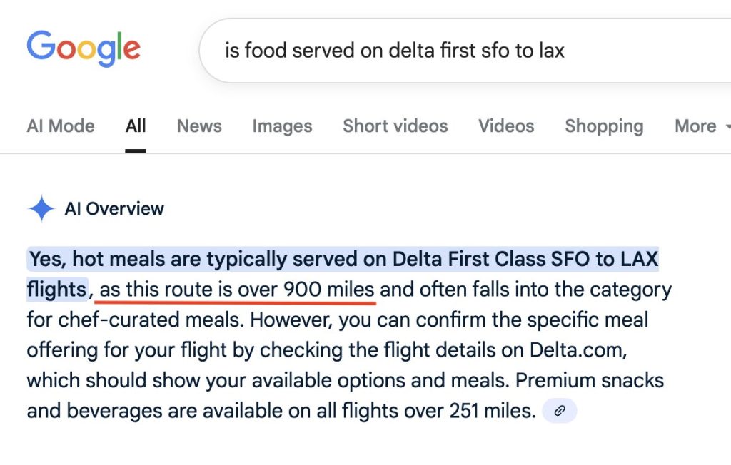 - Justine Moore, posting as, called out Google for rushing a flawed integration of Gemini AI into search results. Her tweet went viral after showing how Gemini confidently claimed a San Francisco to Los Angeles flight is over 900 miles when it’s actually less than 350. Based on this wrong distance, it incorrectly concluded passengers would get “chef-curated meals.” It’s the kind of basic mistake that raises serious questions about testing.