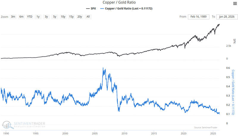 According to analysis shared by SentimenTrader, the ratio reached near multi-decade lows in late 2025, a level historically associated with elevated market caution.