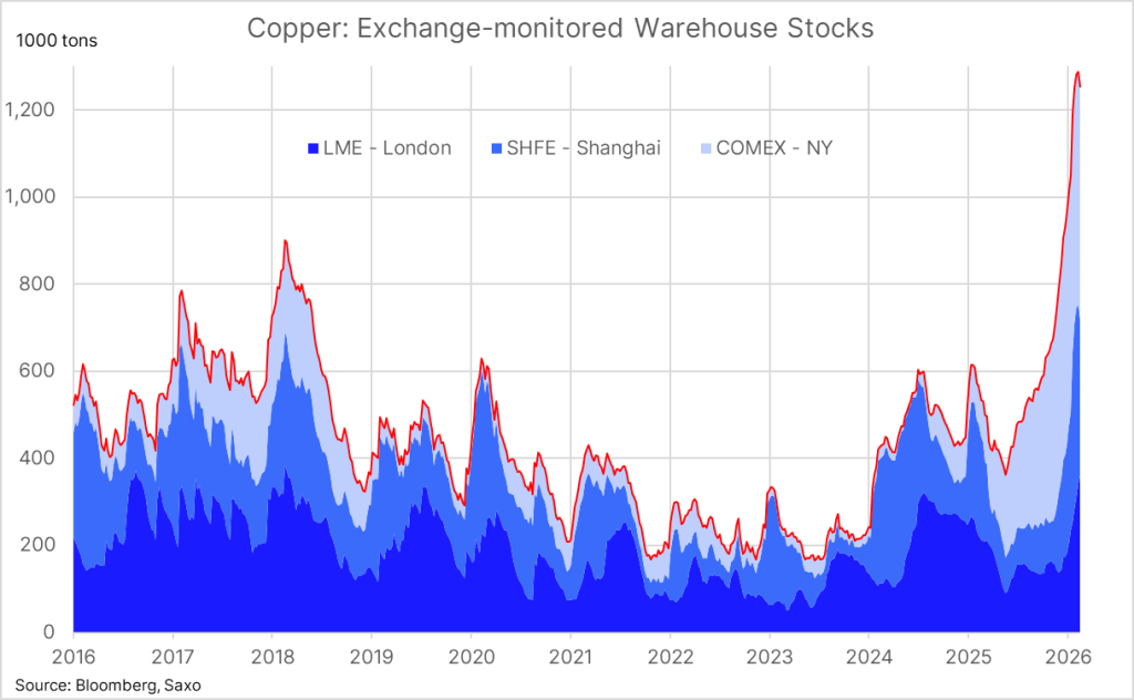 Regional data shows mixed developments across exchanges. London Metal Exchange inventories increased by 17,900 tonnes, while COMEX stocks rose by around 1,000 tonnes. However, these increases were more than offset by the sharp drawdown in China as copper continues consolidating within a long term market cycle, as explained in Copper consolidates for 2 months as long-term cycle builds since 2020