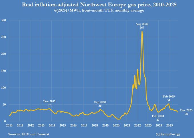 Long-term pricing data highlights how unusual the 2022 surge was. Real Northwest Europe gas prices peaked at approximately €267 per megawatt-hour in August 2022, far exceeding any level observed during the previous decade.