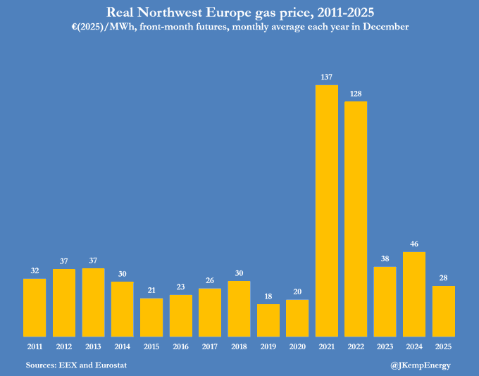 Front-month Dutch TTF futures averaged below €28 per megawatt-hour in December 2025, compared with more than €46 in December 2024 on a real (inflation-adjusted) basis. This represents a decline of roughly 40% year over year, confirming a sustained downward trend throughout the year.