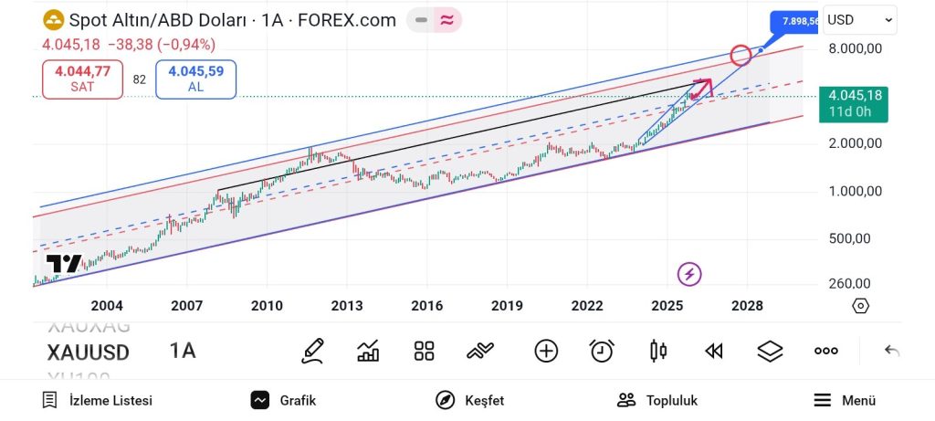 The acceleration phase that began in the 2020s represents a familiar pattern within gold’s cyclical behavior. Sharp advances out of consolidation zones have historically preceded sustained moves toward the upper portions of the channel, and current price action suggests this cycle remains in full force. The projected path indicated by technical analysis points toward potential interaction with the upper resistance zone near $7,800, a target that would represent a continuation of the structural trend rather than an anomalous breakout.