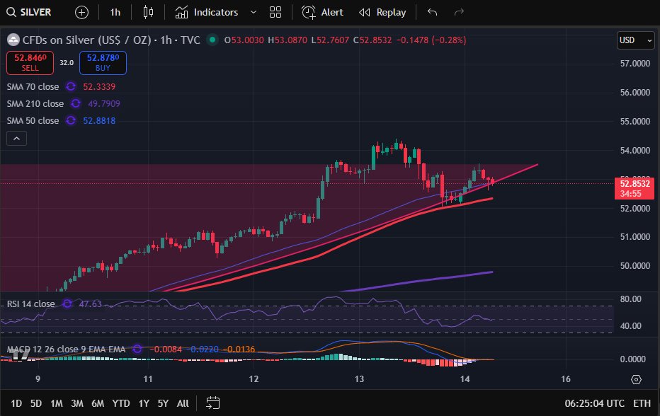 - Technically, silver is moving along a rising trendline, supported by bullish-sloping moving averages (SMA 50, SMA 70, and SMA 210). RSI sits around 47, indicating neutral momentum, while the MACD shows early signs of curling upward—hinting at potential recovery.