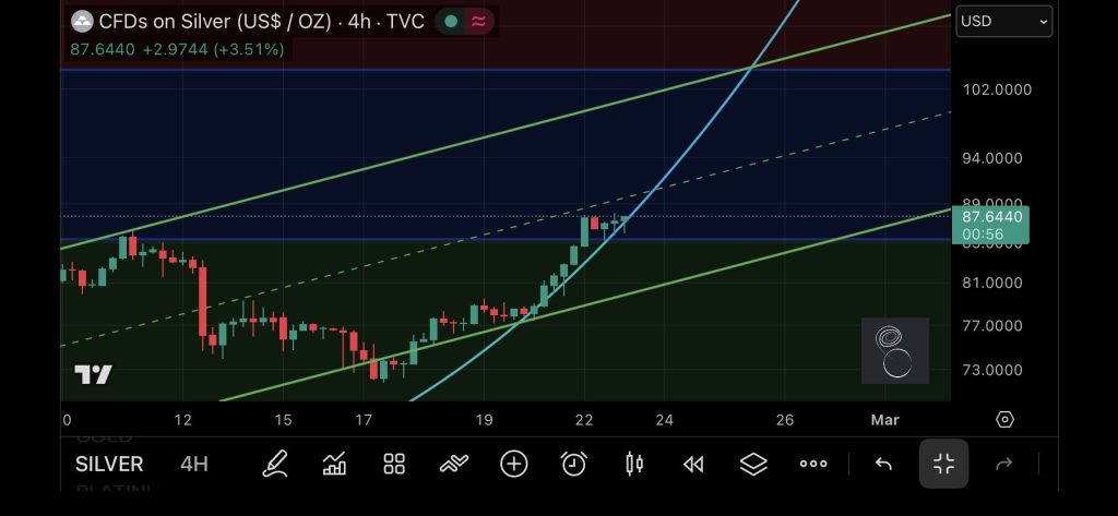At present, silver is holding just below the upper half of its channel near $87.64. This positioning reflects technical friction rather than exhaustion, with buyers continuing to defend higher levels.