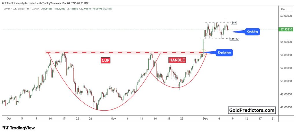 - Silver price action remained in a tight band on Friday as the metal hovered between 56 and 59 dollars following a powerful surge above a long-term resistance zone. The advance stemmed from a completed cup-and-handle formation that triggered a sharp upward move before the market entered a consolidation phase.
