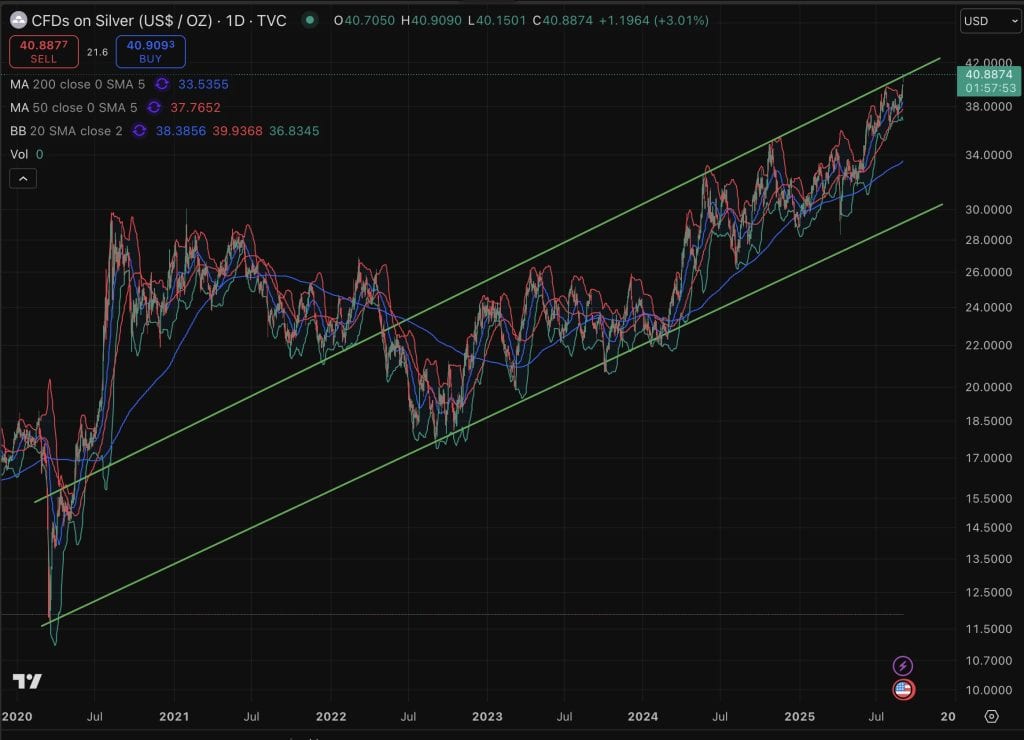 Silver has been stuck in the same pattern since 2019, bouncing between $18 and $38 like a ball in a box. But this week, something changed. The metal punched through the ceiling of this five-year channel, closing at $40.89 with a solid 3% gain. During the session, it even touched $40.91 – the highest we’ve seen in years.