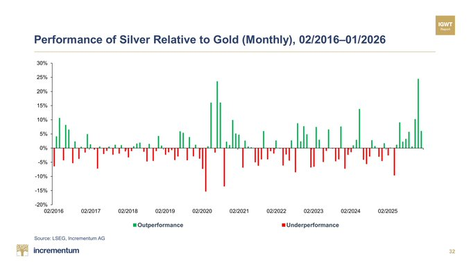 Silver has now beaten gold for nine straight months, marking one of the most persistent stretches of outperformance in the past decade. This represents “9 straight months of silver outshining gold.” Even during January’s sharp selloff across commodities, silver still outperformed gold by more than five percentage points.