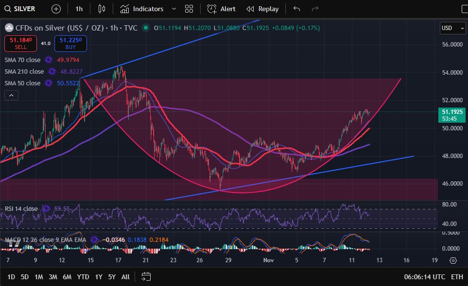 - Silver has entered a consolidation phase after its recent surge, holding steady in overnight trading following strong gains. The metal appears to be setting up for one final touch on the right side of the cup pattern before potentially launching its next upward move.