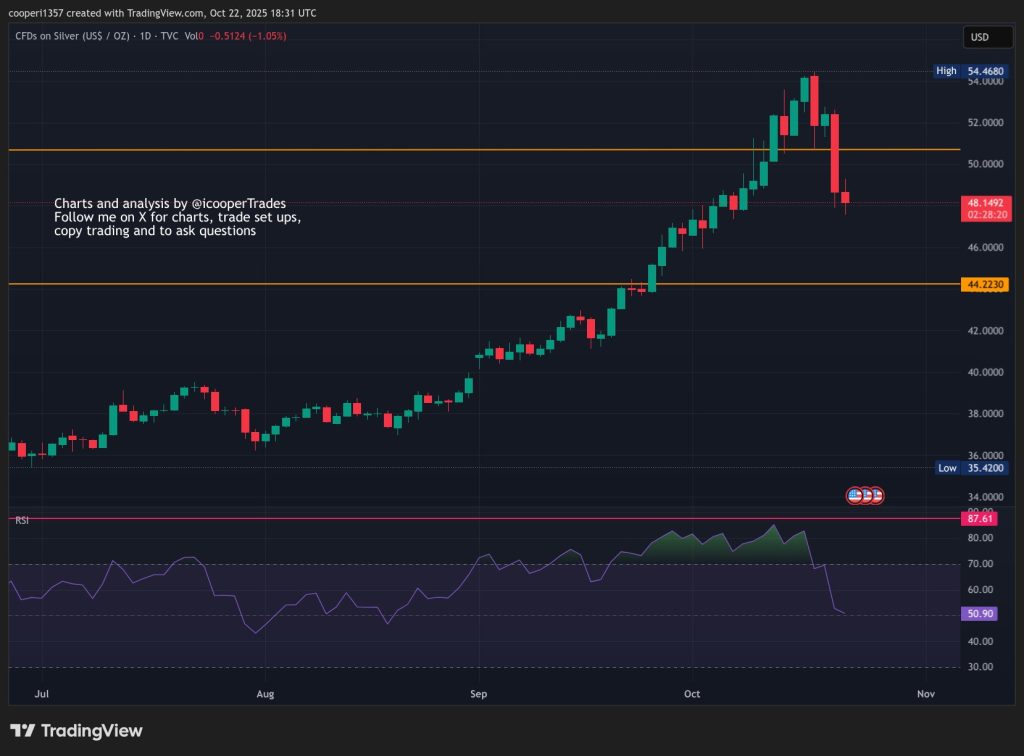 - Silver sits at roughly $48.15, down 1% today. After touching $54.46, it’s pulled back sharply—showing exhaustion at the highs. The chart shows clear signs that buyers are taking a breather after the aggressive move up.
