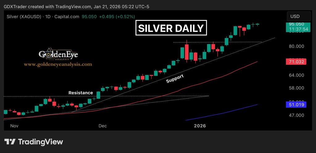 Consolidation near record highs is often a sign of underlying strength. Markets that distribute near tops typically show aggressive downside follow-through, which is currently absent in silver’s price action.