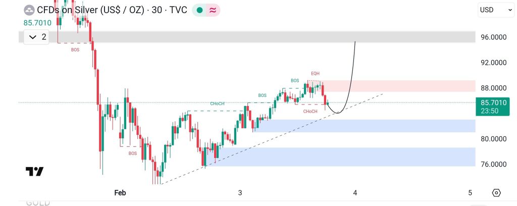 On the 30-minute chart, Silver failed to sustain a breakout above the $87.8–$88.5 resistance zone. This rejection marked a change in short-term character, confirming increasing selling pressure after the breakout attempt stalled. As a result, prices retreated toward the mid-$85 range, where Silver is currently consolidating.