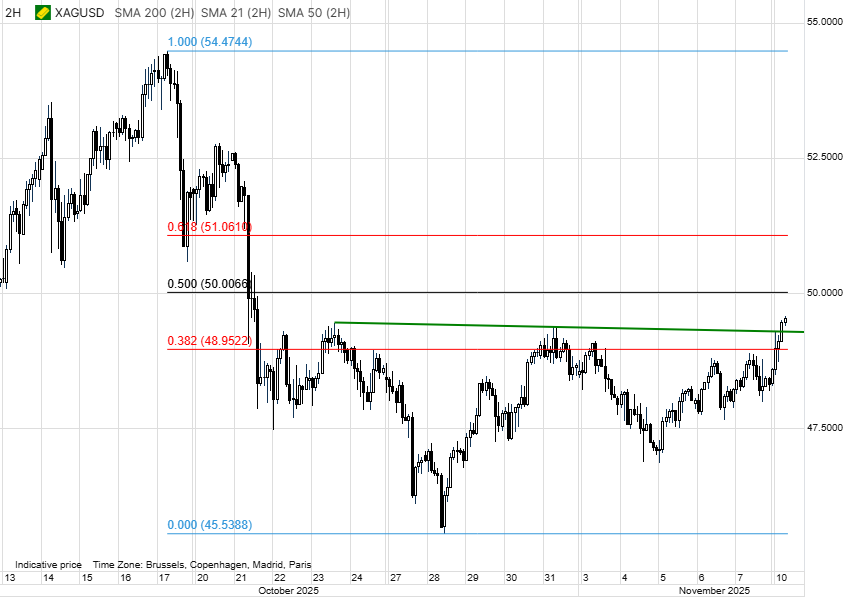 - Silver just hit $49.55, jumping 2.6% and smashing through the key resistance at $49.30. The chart tells the story clearly—price broke above both the horizontal resistance zone and the 0.382 Fibonacci retracement at $48.95, and now it’s pushing toward the 0.500 Fibonacci level at $50.00. That $50 mark is the next big hurdle traders are watching, both technically and psychologically.