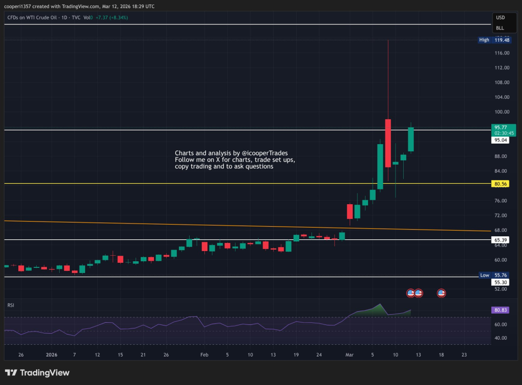 Market attention is now centered on how WTI oil behaves within the $95 to $100 resistance zone, which could act as a decision area for the next move. A rejection could trigger a pullback toward the $80 support region, while a breakout above $100 could signal continued bullish momentum. However, sentiment indicators are not fully aligned with the bullish price action.