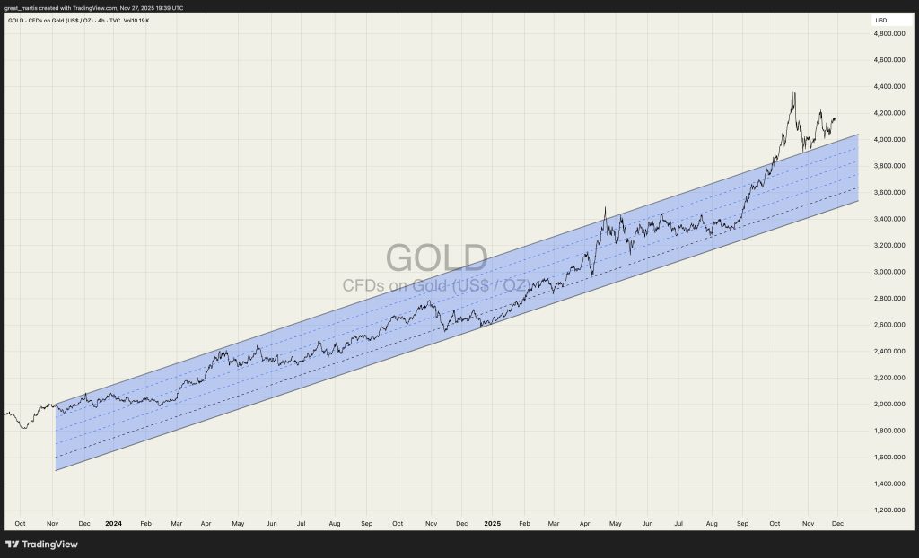 - Gold has drawn fresh attention after recent chart data revealed how closely it’s followed a projected rising path over the past few weeks. Current price movement lines up almost exactly with a trajectory outlined about four weeks ago. The chart shows a persistent uptrend running from late 2023 into November 2025, with gold consistently respecting both the centerline and boundaries of a clearly defined ascending channel.