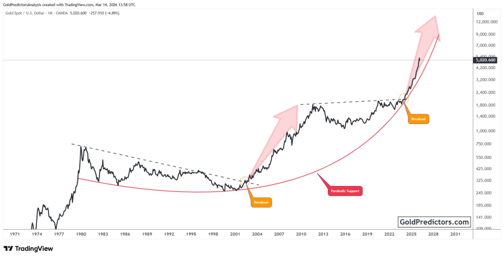 The chart illustrates how gold transitioned from a prolonged consolidation period between roughly 1980 and 2000 into a sustained uptrend after breaking resistance. A similar technical structure appears to be forming again, with price recently pushing above another multi year resistance zone while holding the rising parabolic trendline.