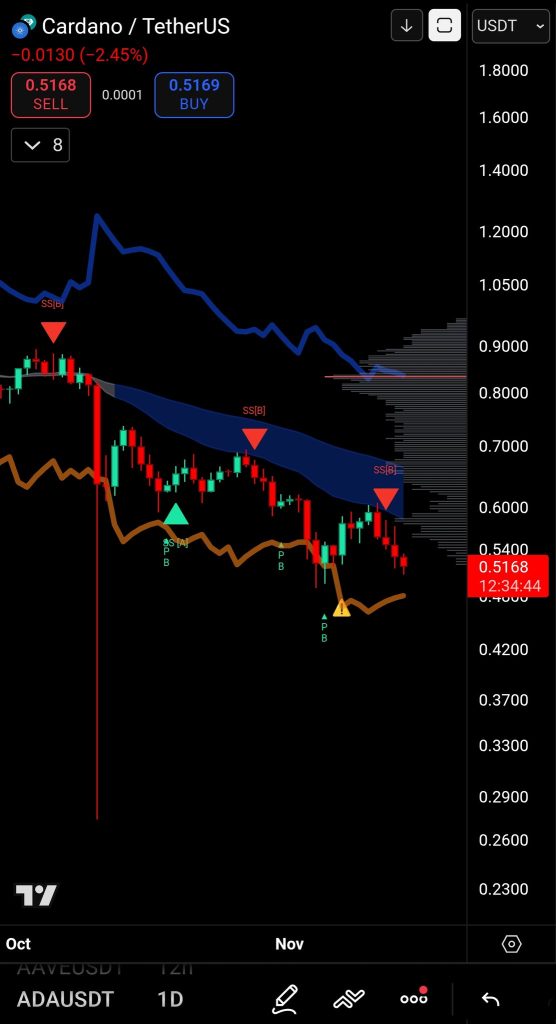 - ADA is still trading below its resistance band, with the trend remaining bearish until price action breaks above this critical level. Currently trading near $0.5168 (down 2.45%), the coin sits compressed beneath a broad resistance zone on the daily chart, signaling weakening momentum. Until ADA reclaims this band decisively, downward pressure is expected to persist.