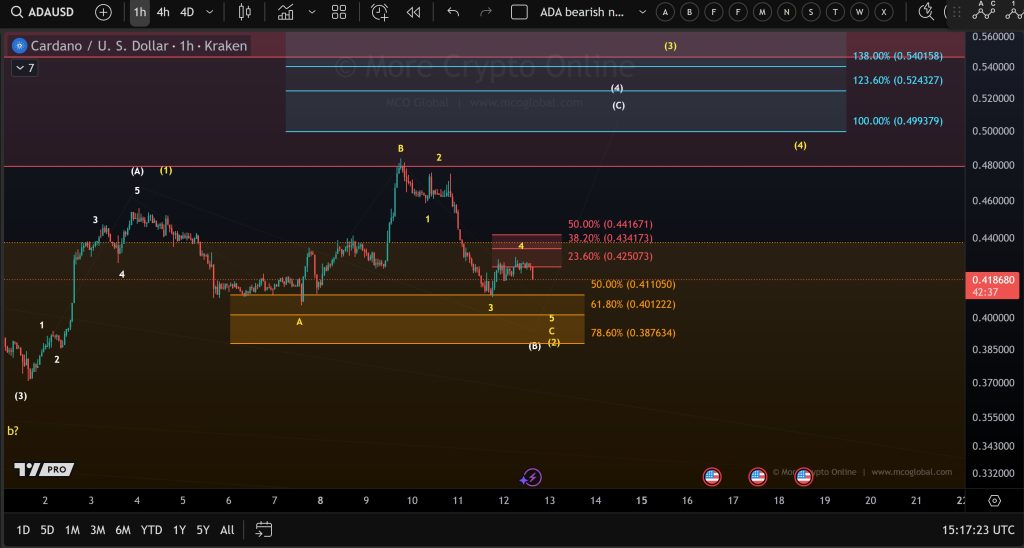 My Take: The $0.40-$0.41 support zone is critical here. If ADA breaks below the 61.8% Fibonacci level decisively, we could see a move toward $0.38. However, a bounce from current levels with volume could invalidate the wave 4 top thesis and push price back toward $0.45-$0.48.