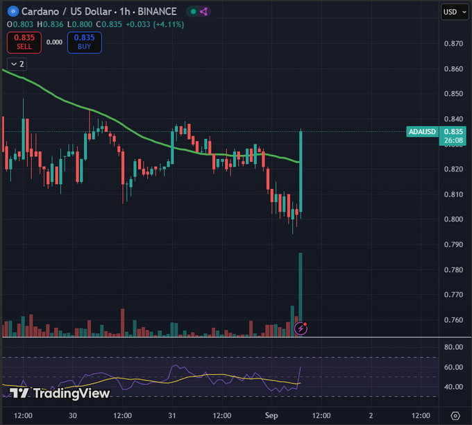 Cardano is finally showing some serious strength, bouncing back from recent lows with a nice spike in both price and volume. On Binance, ADA jumped to $0.835, gaining over 4% in a single day. After weeks of sideways action, ADA is now testing some important resistance levels that could determine where it heads next.