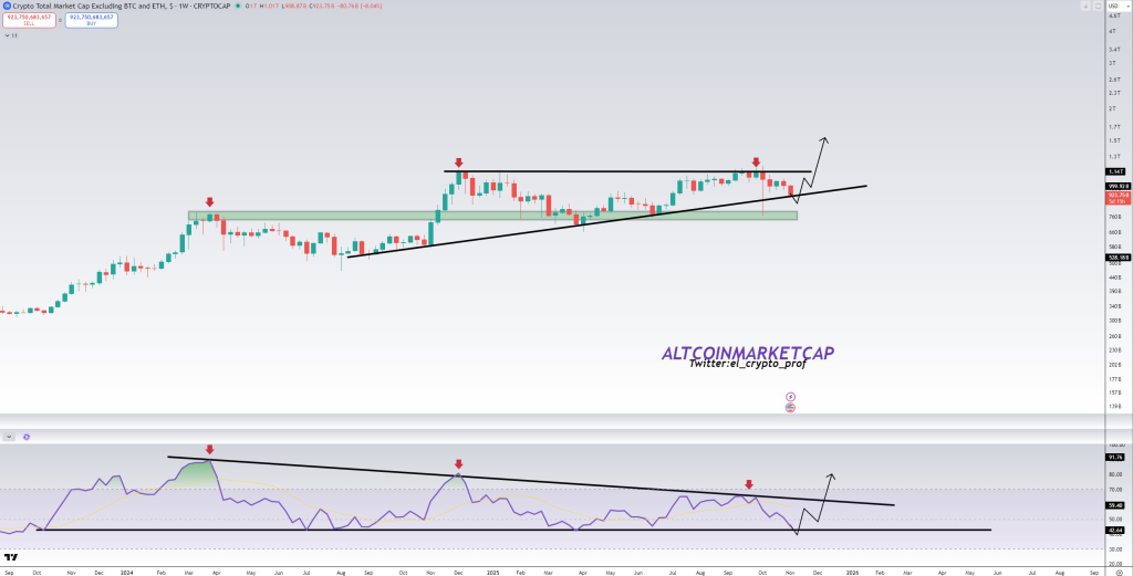 - Crypto analyst Moustache recently shared his view that the altcoin market cap (TOTAL3)—everything except Bitcoin and Ethereum—might be bottoming out after a long correction. His technical analysis shows two bullish signals lining up: a two-year RSI pattern indicating weakening selling pressure and a one-year ascending triangle now testing its support line.
