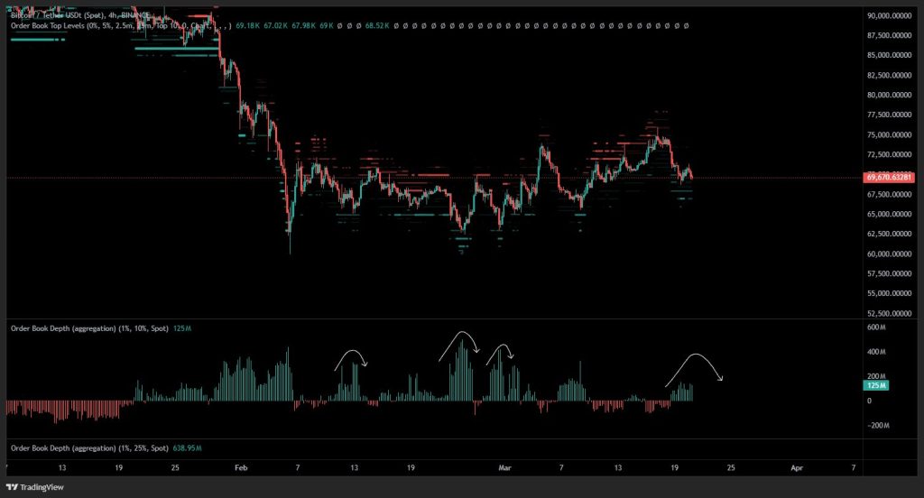 Bitcoin continues to trade in a consolidation range near $69,000 after declining from its recent highs. Traders are now paying closer attention to order book liquidity as they search for favorable entry opportunities. According to recent market analysis, many participants are waiting for stronger positive delta signals in spot depth, a condition that has previously aligned with local price bottoms.
