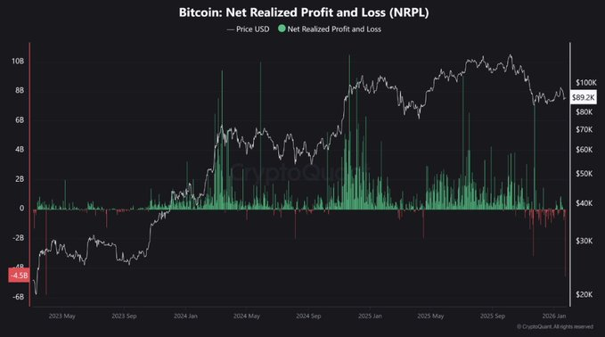 According to CryptoQuant, the Net Realized Profit and Loss (NRPL) metric recorded roughly $4.5 billion in realized losses on January 23.