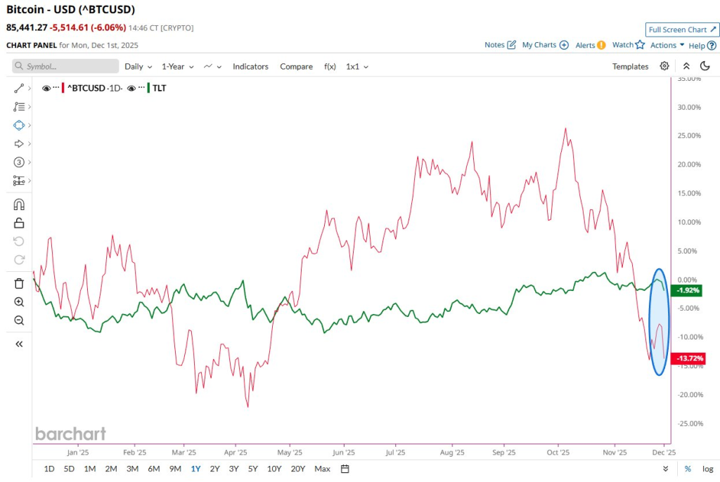 The contrast between BTC’s volatility and the relative stability of government bonds has contributed to this unusually wide performance spread.