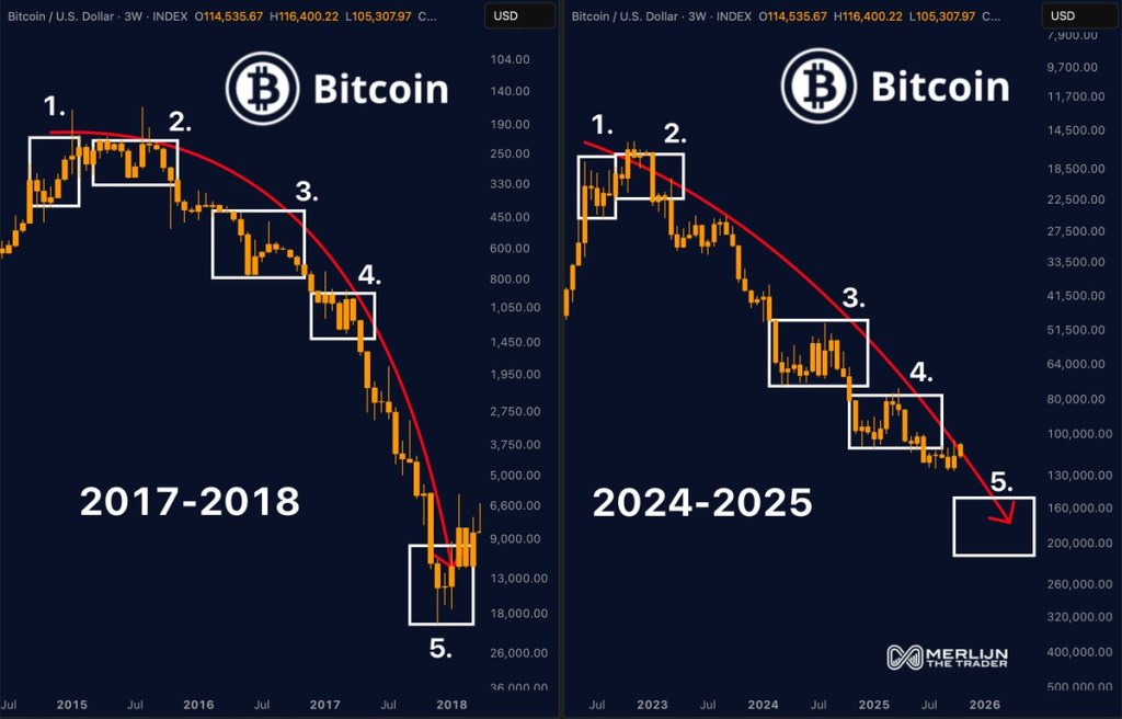 - Trader Merlijn The Trader believes Bitcoin is following the same playbook it used during the 2017–2018 crash. Looking at long-term three-week charts, he’s spotted what he calls striking similarities between then and now—five distinct phases that could mean we’re heading into the final painful leg down before things turn around.