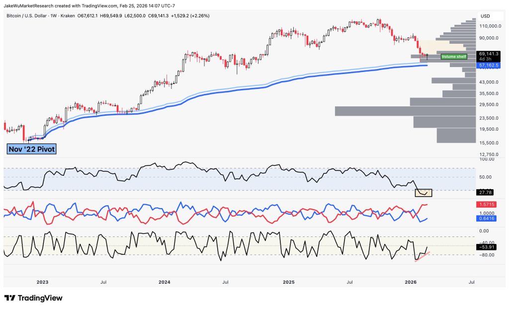 Bitcoin is trading around $69,141 on the Kraken weekly pair, up approximately 2.26 percent, as price action begins to move into a visible volume gap on the weekly chart. This development marks a technically important shift, as BTC transitions away from a high-volume consolidation area and into a thinner liquidity zone.