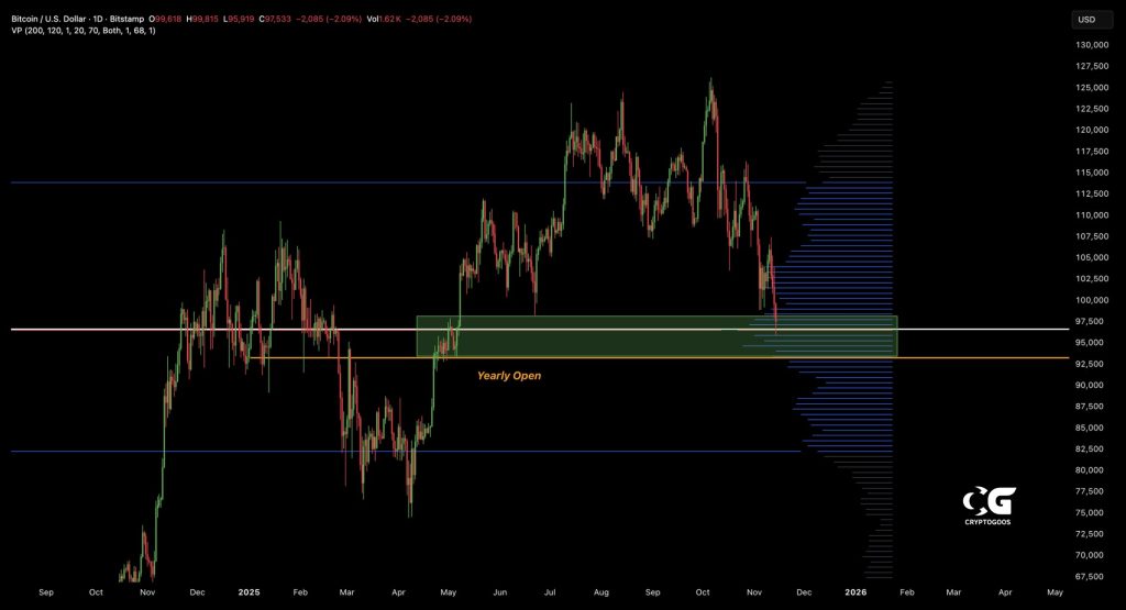 - Bitcoin has reached one of its most significant technical zones of the year. If a bounce is coming, this is where it should happen. Currently trading around $97,500, BTC sits directly on a wide support band reinforced by historical price action and a major Volume Profile shelf. This area also lines up with the Yearly Open near $93,000, creating a concentrated pocket of structural demand.