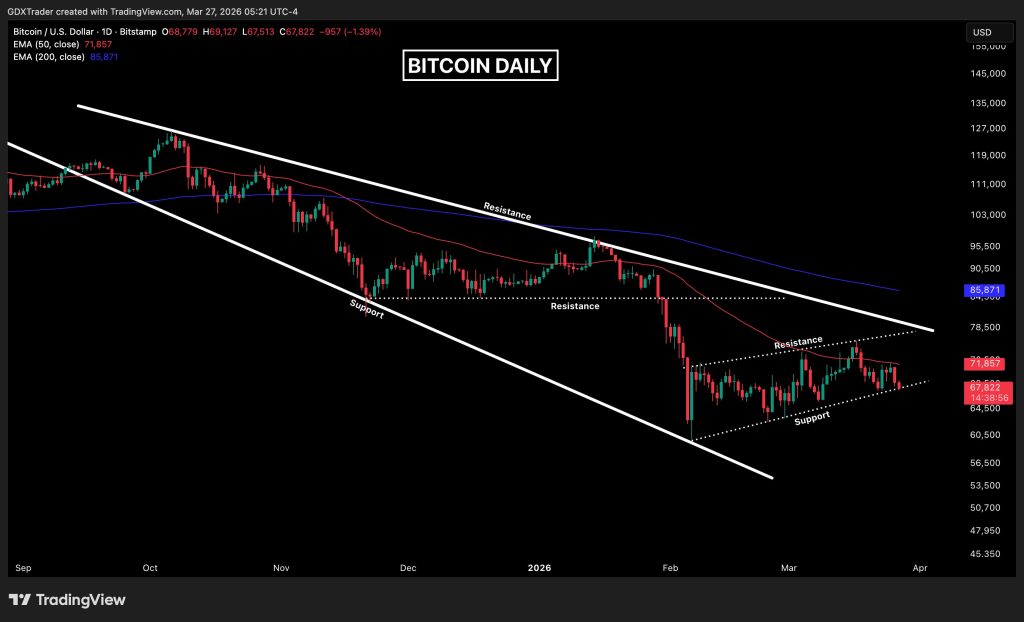 Bitcoin is currently forming a weak recovery structure within a broader descending expanding wedge, a pattern typically associated with continuation pressure rather than reversal. The chart also shows BTC trading below major moving averages, including the 50 EMA and the 200 EMA, reinforcing the dominant bearish structure.
