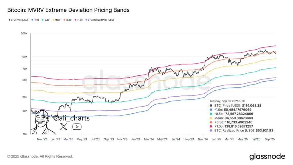 Bitcoin’s price action against MVRV deviation bands reveals several key levels: the spot price sits at $114,063 as of September 30, 2025, while the realized price of $53,931 shows that holders are sitting on substantial profits. The -1σ band at $50,484 marks historical bear market lows, and the mean band at $94,650 has been successfully broken, confirming the strength of the current trend. BTC is now testing the +0.5σ band at $116,733, with the +1σ band at $138,816 aligning closely with the $139K target.