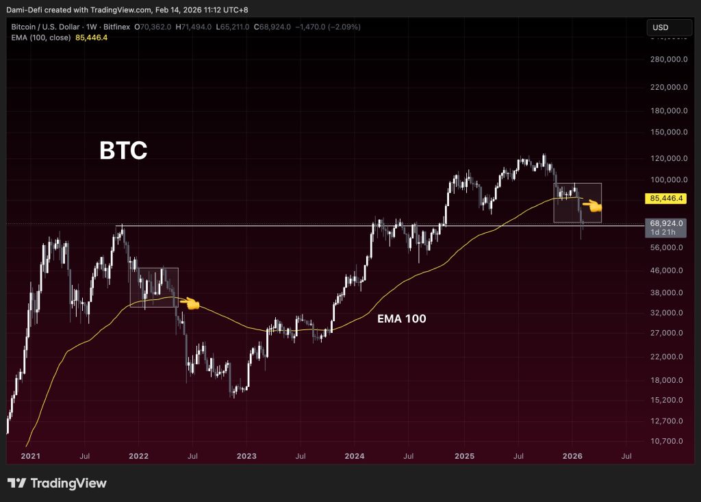 The weekly chart reflects a familiar technical sequence: support, break, retest or rejection, followed by further downside. Bitcoin held the 100-week EMA for months before eventually breaking below it. After the breakdown, price attempted to stabilize but failed to reclaim the moving average, resulting in continued selling pressure. The failure to recover this level signals a potential structural shift rather than a temporary pullback.