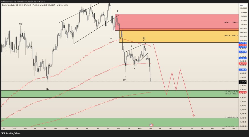 Technical projections now point to the $65,000–$69,000 range as the next major support zone. This area represents a critical demand region where Bitcoin may attempt to stabilize or form a base. A strong reaction here could slow the decline and open the door for consolidation.