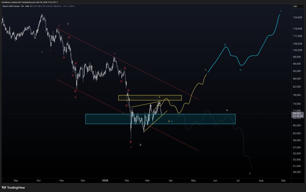 Current technical scenarios remain relatively clear. If Bitcoin manages to hold the $65,000 support level, the market could begin forming a projected C wave or Wave 3 structure based on the Elliott Wave framework. This scenario would open the path toward another bullish expansion.