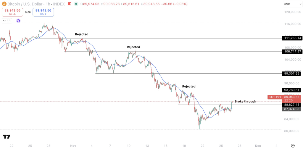 - Bitcoin just did something it hasn’t managed since tumbling from $116K – it actually broke through a resistance level instead of getting smacked back down. After weeks of failed rallies and fresh lows, BTC finally pushed above the $89K range that’s been capping price action throughout this entire downturn.