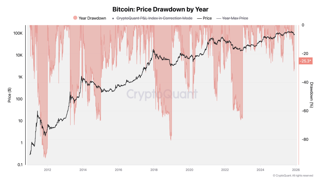 - Past BTC downturns regularly hit 50% to 80%, especially during the brutal bear markets of 2014, 2018, and 2022. Today’s correction looks mild by comparison, even with ongoing price swings. If a broader pullback does materialize, it might play out as an extended sideways grind rather than a sharp plunge. This shift reflects improved liquidity and more diverse demand across the market.