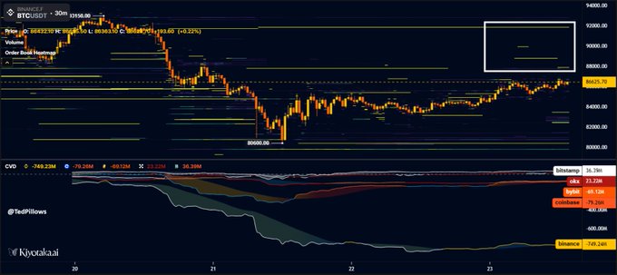 Bitcoin is showing increasing overhead pressure as large sell orders cluster in the $88,000 to $91,000 zone. This area has become active on the order book, suggesting sellers may be trying to cap further upside. The chart highlights this liquidity band, with Bitcoin trading around the mid-$86,000 range during the latest session.