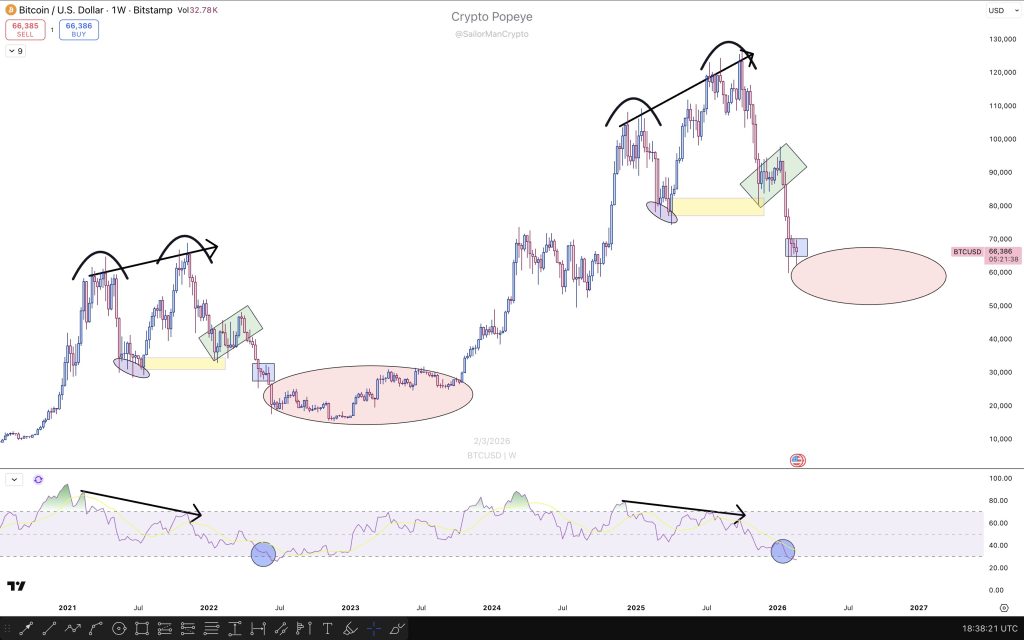 On the weekly timeframe, the current pattern reflects a rounded distribution top followed by an aggressive correction phase — a structure that closely mirrors previous cycle behavior. If historical symmetry continues to unfold, Bitcoin could enter an extended consolidation period before any sustained bullish reversal develops.