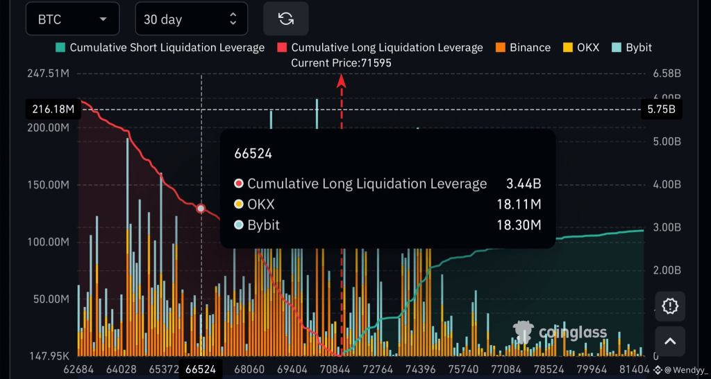 The liquidation chart shows BTC trading near $71,595, while a dense liquidation pocket appears near $66,524, aligning with the $66,000 to $67,000 danger zone highlighted by market observers. Data across major derivatives exchanges including Binance, OKX, and Bybit shows significant leveraged exposure concentrated in this range. The visualization indicates cumulative long liquidation leverage of approximately $3.44 billion, suggesting that a decline of roughly $5,000 could begin a chain of forced position closures typical in highly leveraged crypto markets.