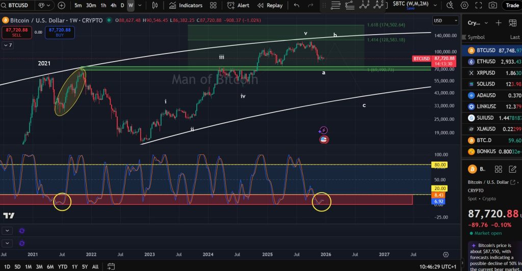 - Bitcoin (BTC) is currently in oversold territory according to the Stochastic RSI on the weekly chart. The indicator is deeply below the 20 level, signaling that BTC could be nearing a rebound. A decisive move above the 20 level would likely signal renewed upside momentum. The preferred target for this move is at least a B-wave high. However, the possibility of another low in wave-a is still a consideration, meaning further downside risk is present before a recovery.