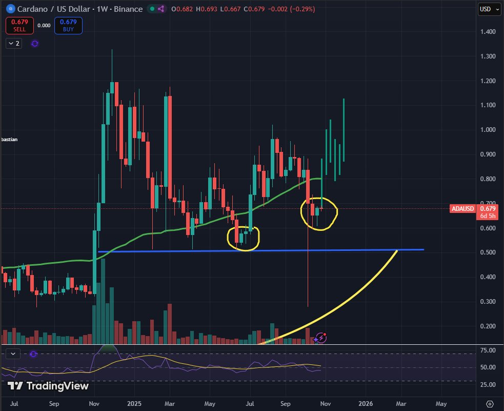 - 200-Week Moving Average Support: ADA continues trading above this critical long-term trendline (green line), which typically separates bear market corrections from bull market recoveries