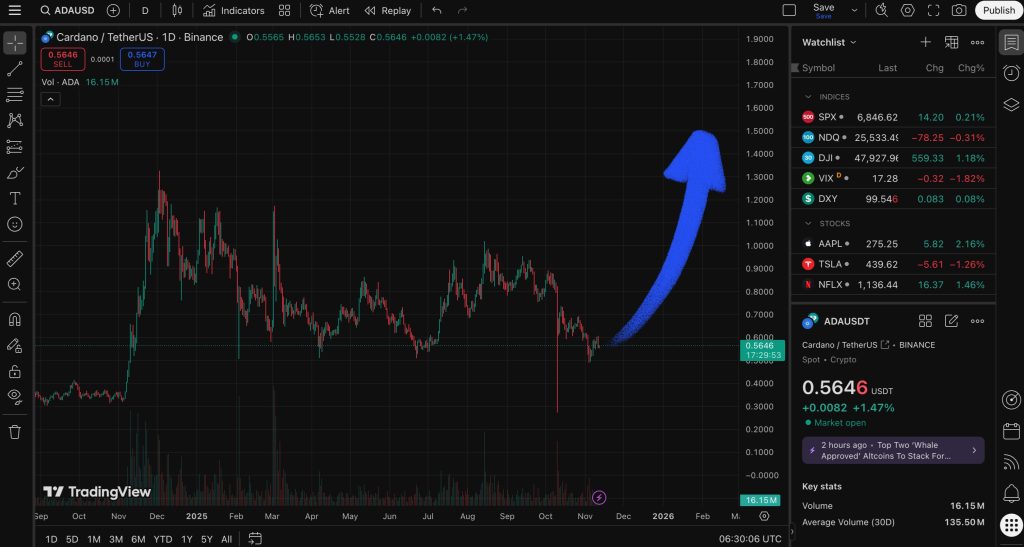 - Cardano (ADA) is showing signs of life after an extended consolidation period. Trading around $0.5646 on Binance, the asset has gained 1.47% and appears to be forming a base near the $0.55–$0.56 range. Buyers are starting to step in at these levels, which could mark the beginning of a shift in sentiment.