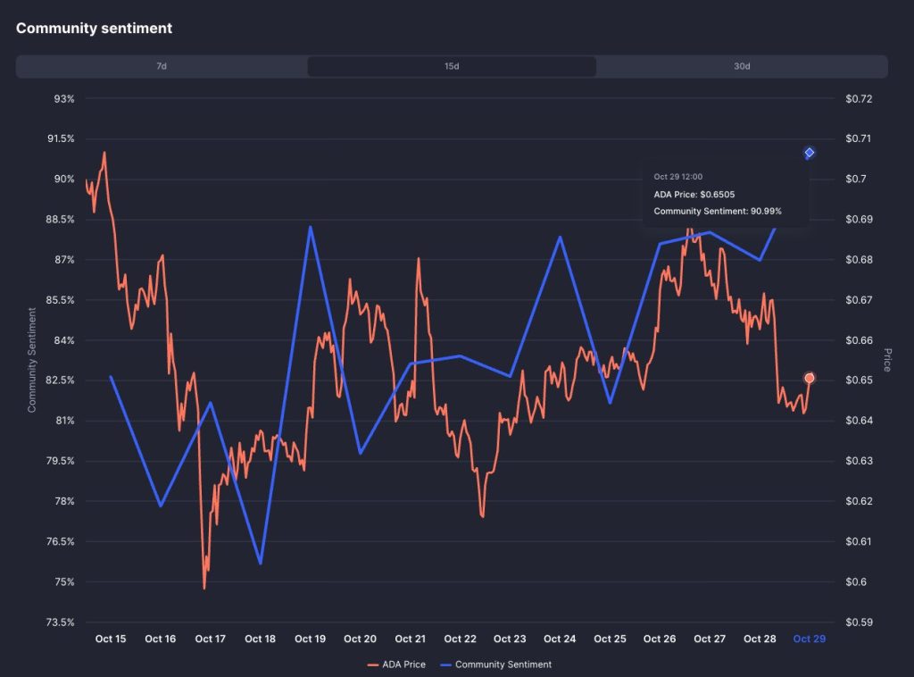 - This renewed enthusiasm comes at an interesting time. While sentiment is climbing, ADA’s price has been stuck in a relatively tight range—bouncing between $0.59 and $0.71 over the past two weeks and settling near $0.65 on October 29. The disconnect between rising optimism and sideways price action is worth watching. If momentum doesn’t pick up soon, there’s a risk we could see a short-term pullback.
