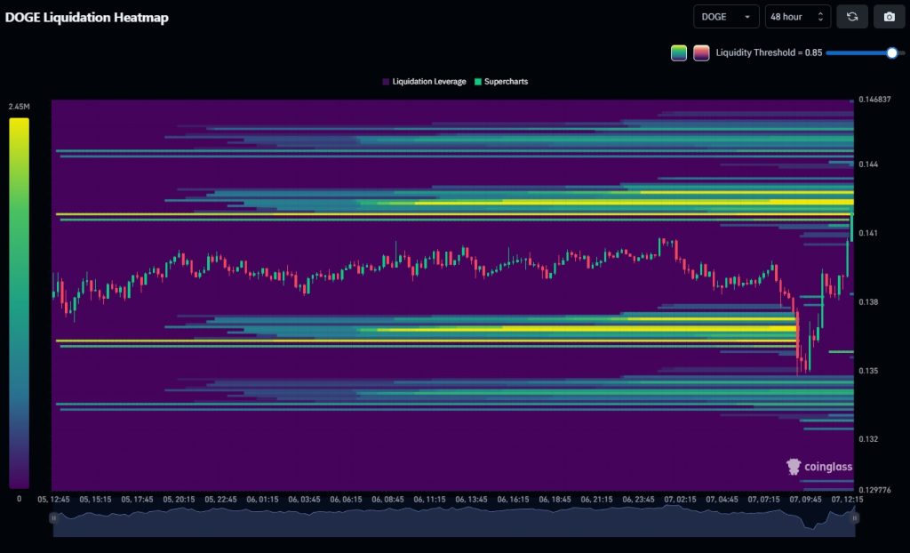 DOGE Jumps as Liquidity Sweep Targets Short Positions Around $0.135-$0.144