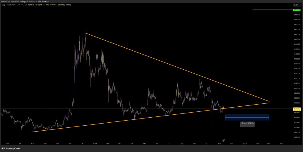 - Dogecoin is trading directly on an ascending support line that’s held for over a year. The chart shows a clear symmetrical triangle: a downward resistance line from the previous peak and a rising support underneath. Price is hovering just above $0.17, a historically significant level during consolidation periods.