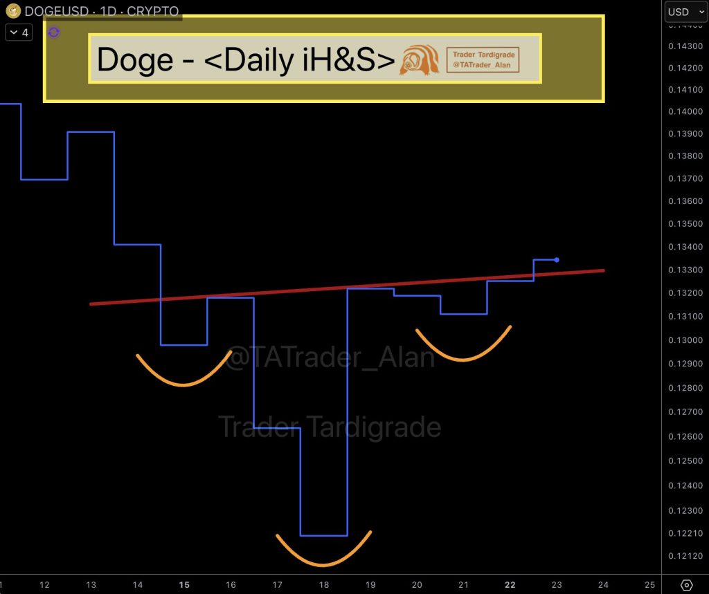 - A daily Dogecoin chart highlights a developing inverse head and shoulders formation. The pattern is drawing attention as price trades near a key neckline area.