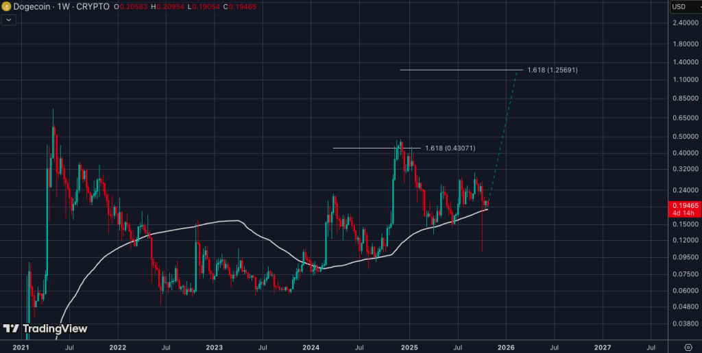 Essentially, if DOGE breaks cleanly above the $0.25–$0.30 resistance zone, the chart suggests a rally first toward $0.43, and then—if momentum holds—a potential long-term push into the $1+ range. This wouldn’t be new territory for Dogecoin; historically, it’s shown this exact pattern: long quiet periods followed by explosive vertical runs once retail momentum kicks back in.