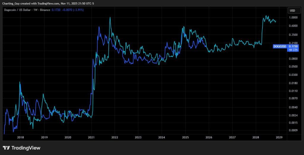 - The comparison highlights how both coins experienced massive rallies during bull markets, only to enter multi-year periods of flat price action. Currently trading around $0.17, Dogecoin could potentially face years of sideways movement, echoing XRP’s post-2017 peak behavior.