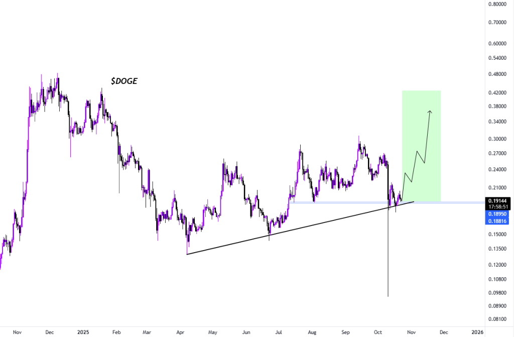 - Dogecoin (DOGE) has been trading within an upward-sloping structure throughout 2025, with a clear ascending trendline acting as dynamic support. The chart shared by @thescalpingpro highlights a recent bounce from this support zone, signaling renewed buyer activity at approximately $0.19–$0.20 — levels that have repeatedly attracted accumulation since mid-year.